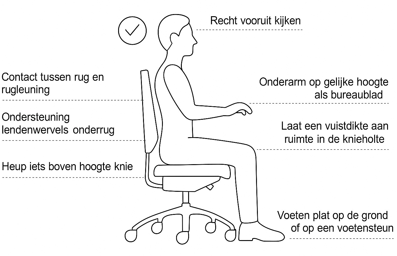 Streeft u naar een gezondere en productievere werkomgeving? Onze ergonomische bureaustoelen zijn de sleutel tot comfort, ondersteuning en efficiëntie tijdens uw werkdag. Ontdek vandaag nog de voordelen van ergonomisch zitten voor uw welzijn en prestaties. Zithouding instellen Juiste zithouding: rug tegen rugleuning, heup iets boven knie, onderarm op bureaubladhoogte, voeten plat op de grond of op voetensteun Stel de stoel zo in dat u recht vooruit kijkt, lendensteun voelt en een vuistdikte ruimte bij de knieholte behoudt. Onze verkoop top 3 ergonomische bureaustoelen staat hier direct onder.